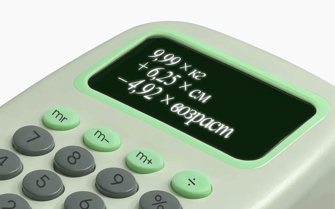 Базовый метаболизм = 9,99 × (вес в кг) + 6,25 × (рост в см) – 4,92 × (возраст в годах) – 161