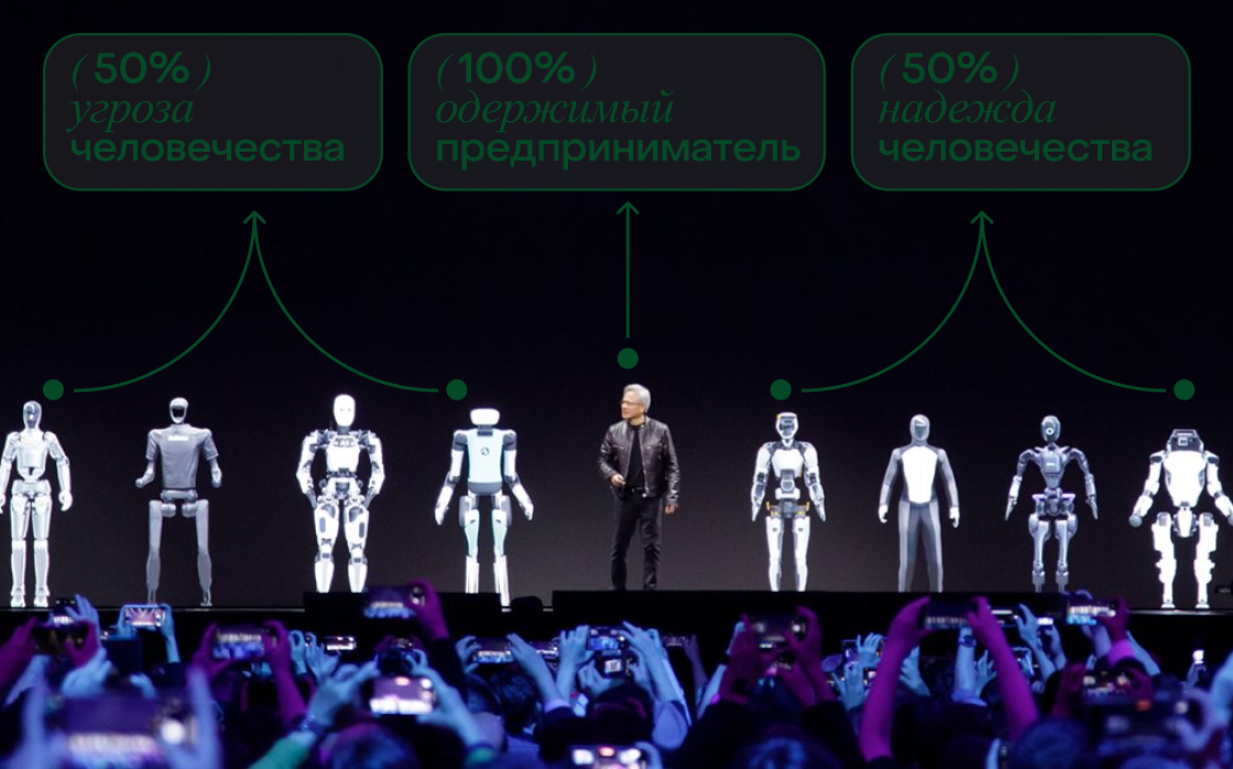 «Наша беседа, впрочем, началась на дружеской ноте. Я поздравил Дженсена с успешным выступлением на открытии конференции, затем расспросил о жизни на Тайване, о семье и о том, как он справляется с известностью. Его ответы были краткими и точными. Но потом я поинтересовался, какие новые профессии может создать ИИ.