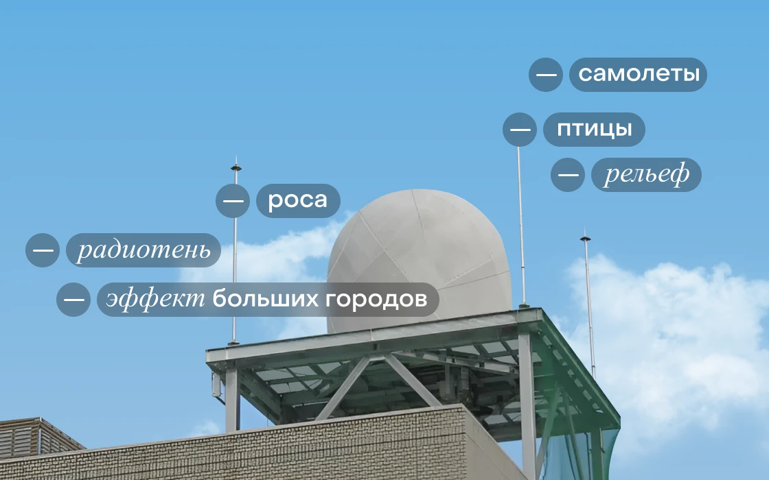 Юрий: Метеорадары в городах — кладезь таких историй. Например, Москва-Сити для радара из Внуково создает огромную «радиотень», отражает и не пропускает сигнал. Мы именно эти радары не используем, но похожие ситуации наблюдали во многих странах, например в Испании, где горы или высотки экранируют половину обзора. Это, скажем так, стационарные аномалии. Есть и движущиеся. Самолеты, стаи птиц: когда они пролетают близко к радару и делают разворот, на картинке появляются яркие засветы, которые можно принять за сильный ливень.